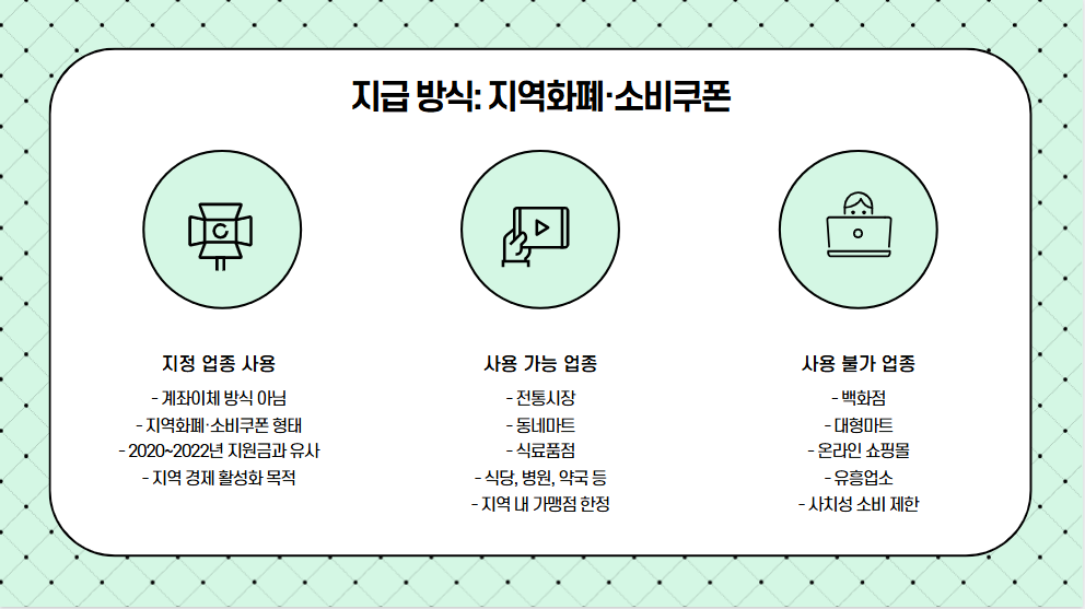 지원금은 단순 계좌이체 방식이 아닌, 지정된 업종에서만 사용 가능한 지역화폐·소비쿠폰 형태로 제공됩니다. 이 방식은 2020년~2022년 긴급재난지원금 및 국민지원금 사례와 유사합니다.
