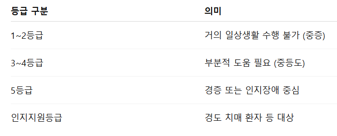 총 6단계로 나뉘며, 각 등급에 따라 받을 수 있는 서비스 내용과 지원 범위가 달라집니다.