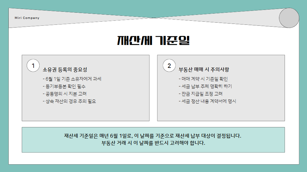 재산세 기준일은 매년 6월 1일입니다. 이 날짜를 기준으로 소유권이 등록되어 있어야 해당 연도의 재산세 납부 대상이 됩니다.
