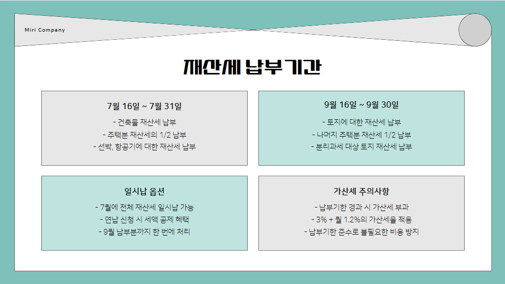 즉, 주택을 소유한 경우 7월과 9월에 각각 절반씩 나눠 내야 하며, 7월에 한 번에 일시납도 가능합니다. 이 기간을 넘기면 가산세가 부과되므로 주의해야 합니다.